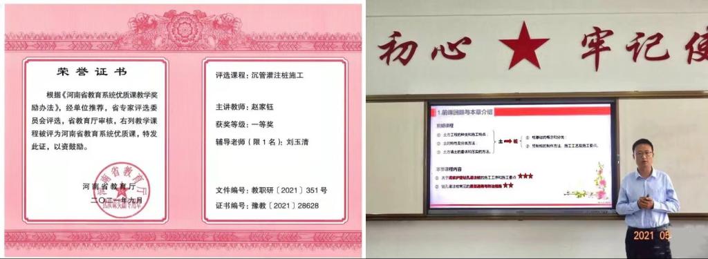2021年5月28日,yl7703永利集团教师赵家钰参加2021年河南省中等职业学校优质课教学评选,参选课程《沉管灌注桩施工》荣获河南省教育系统优质课一等奖。