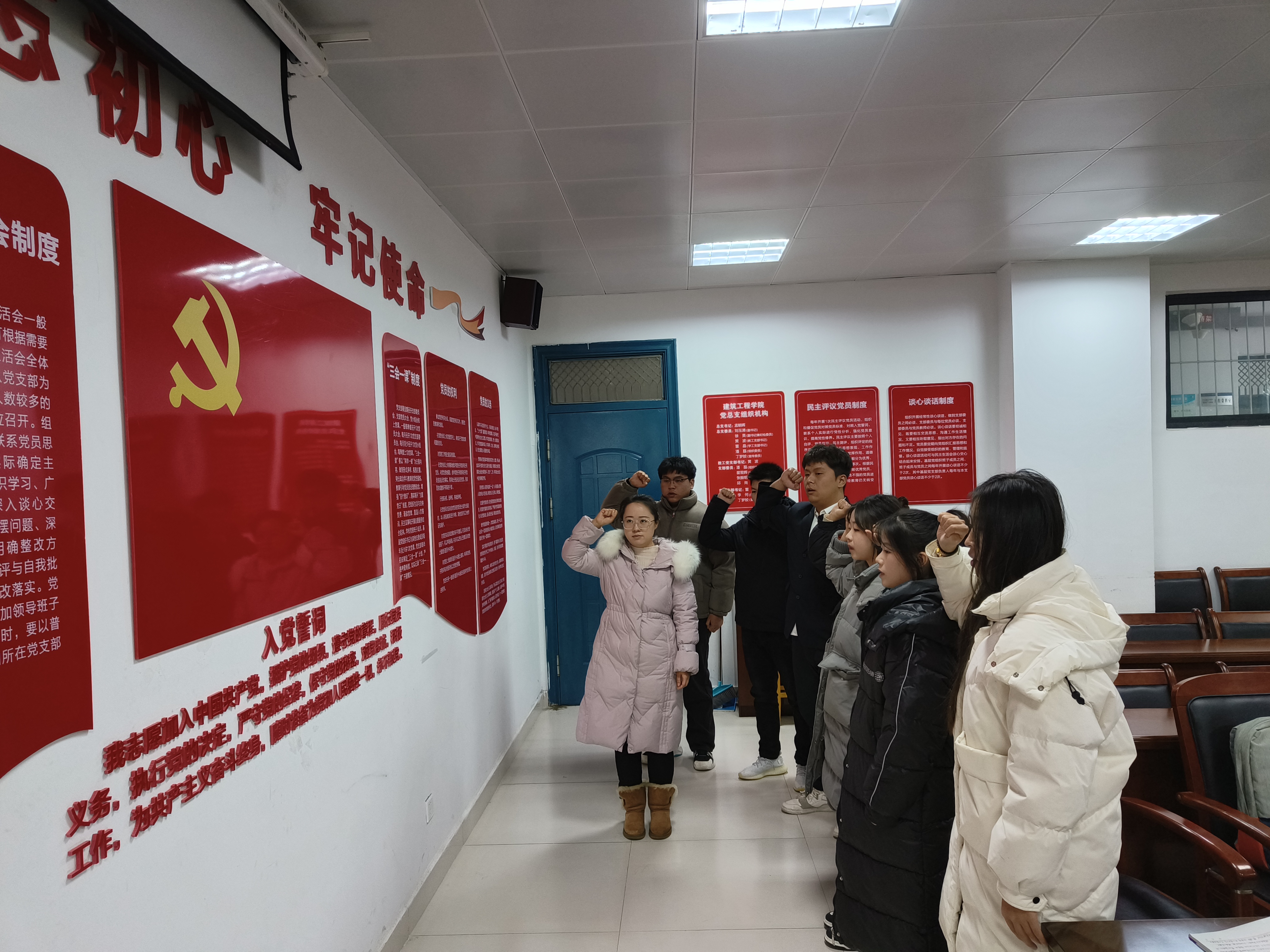 7名学生党员发展对象在大会上做了个人基本情况汇报,表明了入党愿意;入党介绍人就发展对象的日常表现、思想动态等向大会做了说明;与会党员教师展开讨论,并通过无记名投票,一致同意接收7名党员发展对象成为中国共产党预备党员;支部宣传委员丁梦娇带领新入党学生面向党旗进行了庄严宣誓。