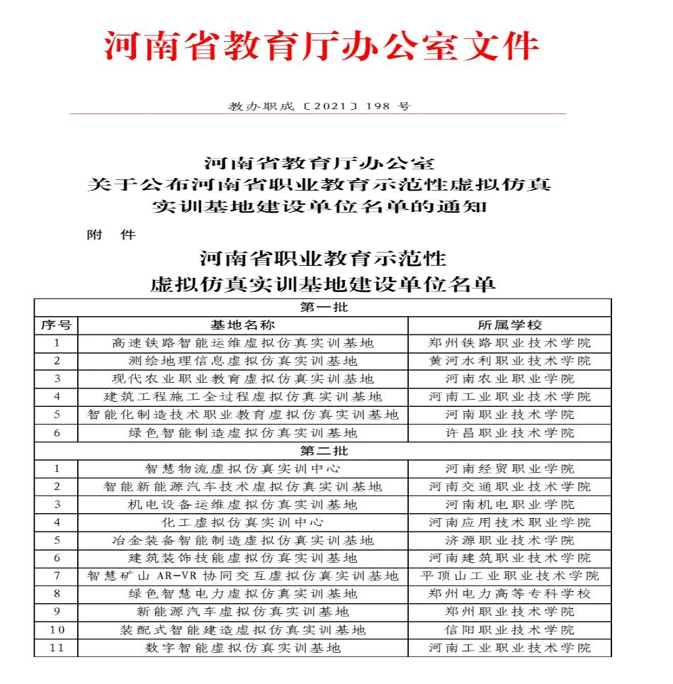 根据教育部《关于开展职业教育示范性虚拟仿真实训基地建设的通知》(教职成司函[2020]26号)和《河南省教育厅办公室关于开展河南省职业教育示范性虚拟仿真实训基地建设工作的通知》(教职成函[2021]360号)的要求,从2021年6月底开始yl7703永利集团积极组织相关专业老师,依托我院数字化实训中心建设,同时根据我院专业特色并结合当下建筑市场趋势,认真准备申报材料,最终按照文件要求完成申报工作。省教育厅通过组织专家进行资料审查,综合评审,最终确定我院装配式智能建造虚拟仿真实训基地参加河南省职业教育示范性虚拟仿真实训基地建设工作。