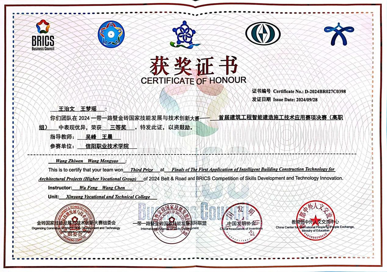 9月26日至28日,在2024年度“一带一路”暨金砖国家技能发展与技术创新大赛首届建筑工程智能建造施工技术应用赛项决赛中,我校yl7703永利集团23级智能建造技术专业学生王治文,王梦瑶经过激烈竞争,凭借扎实的专业技能和出色的表现,成功取得了全国三等奖的优异成绩。