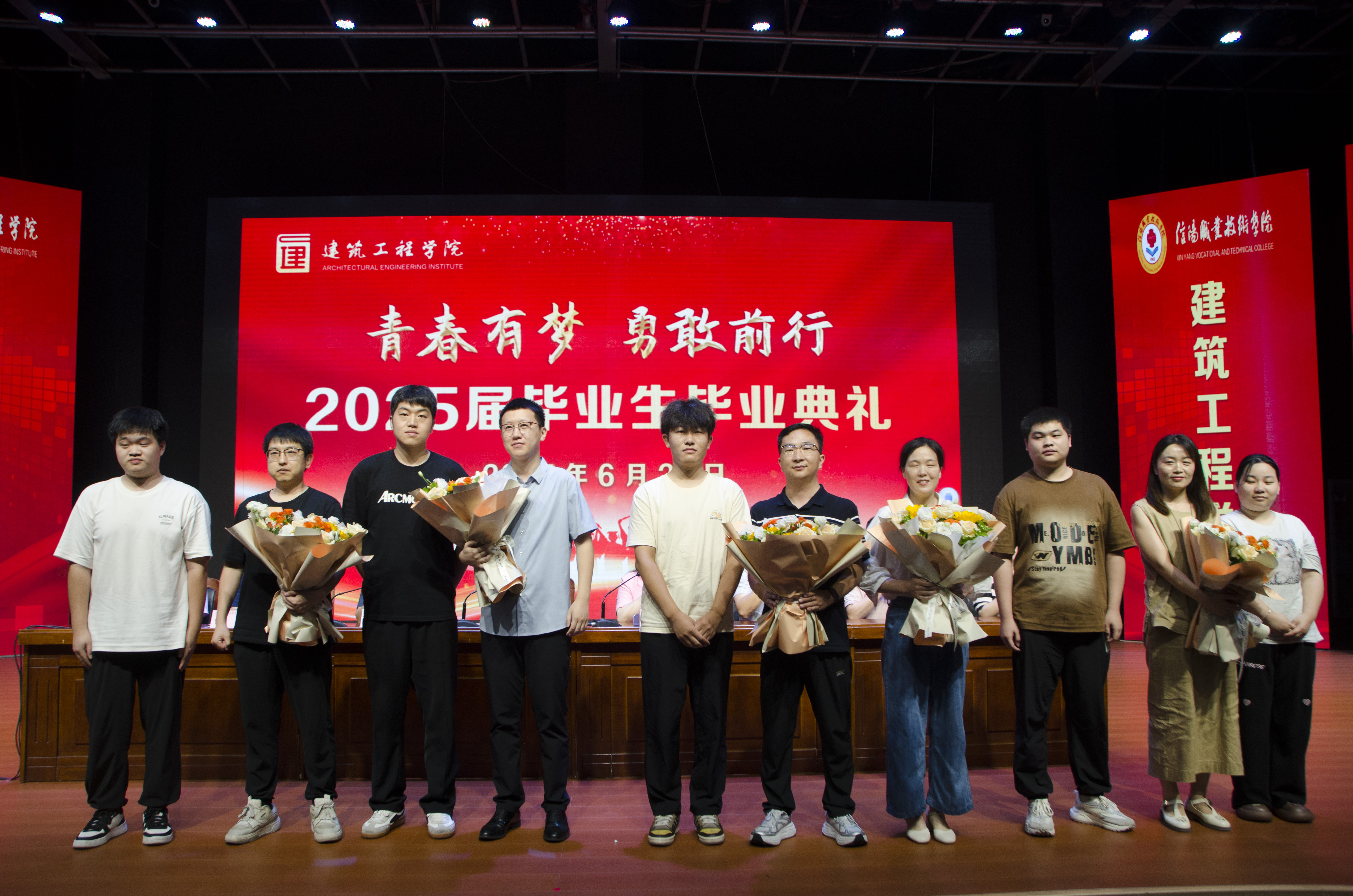 典礼在庄严的国歌声中盛大开启。这激昂的旋律,是青春的号角,更是梦想启程的宣言!院长岳建伟宣读《yl7703永利集团2025届省级、校级优秀毕业生名单》。当领导老师们为优秀学子颁发证书时,全场掌声雷动。毕业生代表田煜琳分享了求学路上的追梦故事与对未来的憧憬,教师代表闻晶晶、辅导员代表李雪莹则送上饱含深情的临别赠言与前行嘱托,字字句句皆是情谊与力量。最动人的环节莫过于学生代表向教师代表和全体毕业班辅导员献上鲜花。一束芬芳,万千感恩,感谢每一位为学子梦想插上翅膀的筑梦人!