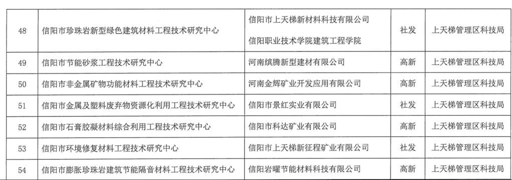 “信阳市珍珠岩新型绿色建筑材料工程技术研究中心”