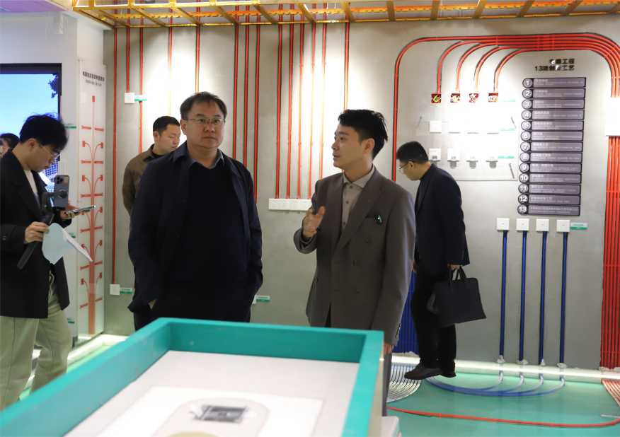 公司董事长李鹏飞的陪同下,郑洪涛一行首先参观了企业的可视化工程管理系统、材料和工艺展示区以及家居样板区,全面了解信阳交换空间装饰有限公司的绿色家装数字化发展进程。调研过程中,双方就人才培养、产学研合作、学生实习就业等工作交换了意见。